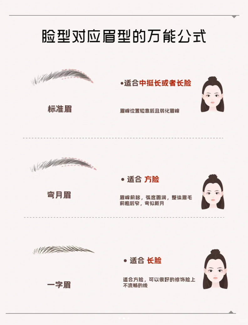長臉:適合平眉,平緩柔和的一字眉可以拉長臉的寬度,視覺上減弱中庭的長度。